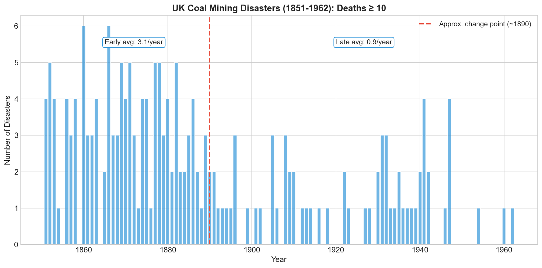The early years average around 3 disasters per year. The later years average closer to 1. Somewhere in between, something changed. We want to find that transition point. Naruraly in the data above we can see that but how can we be more scientific about it?