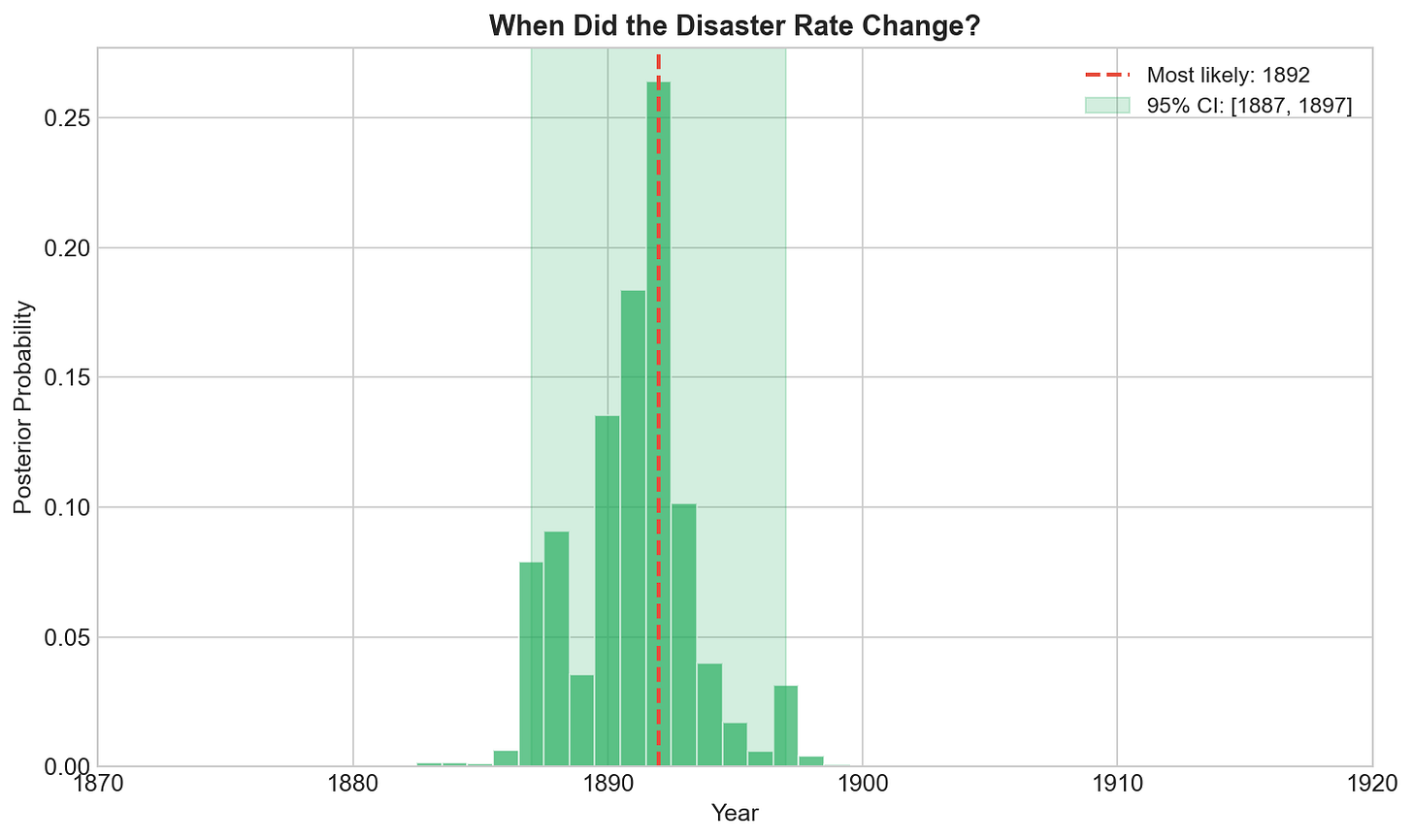 The posterior shows high probability mass around 1889-1891. This is our best estimate for when the change occurred, with uncertainty quantified.