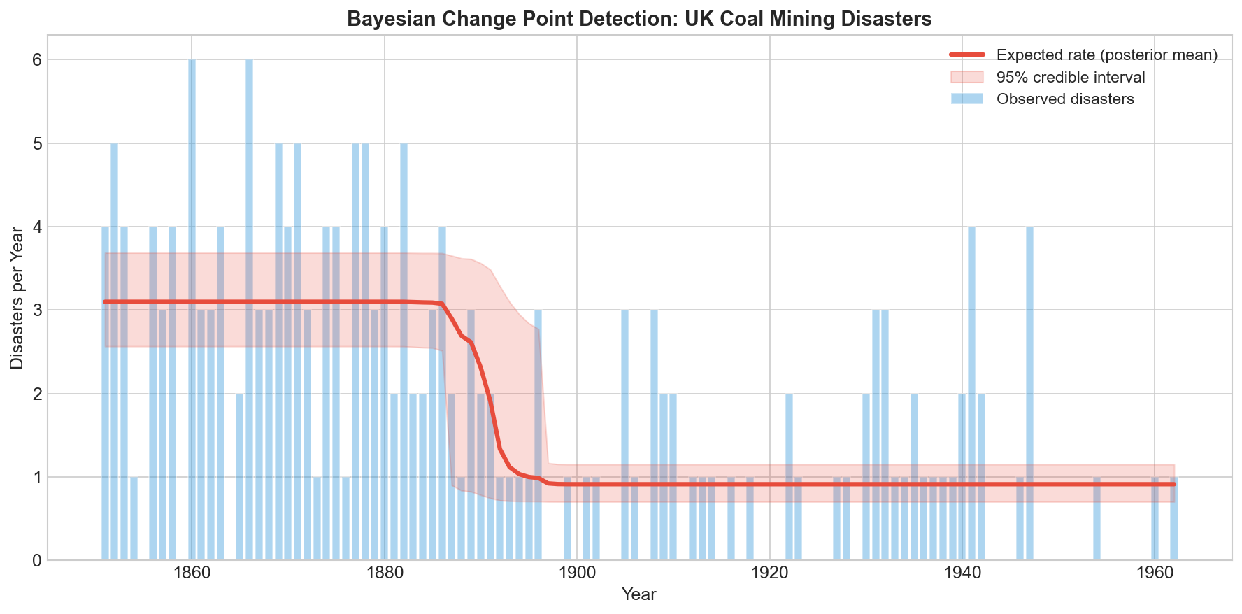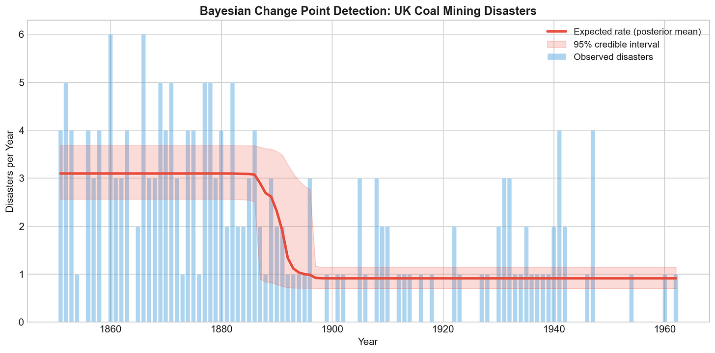 For the coal mining data, the model finds a change around 1890, with the disaster rate dropping from about 3 per year to about 1. This aligns with the historical record: the Coal Mines Regulation Acts of 1872 and 1887 had fundamentally transformed the industry by this point. The model, knowing nothing about Victorian politics, independently arrives at the same conclusion historians would.