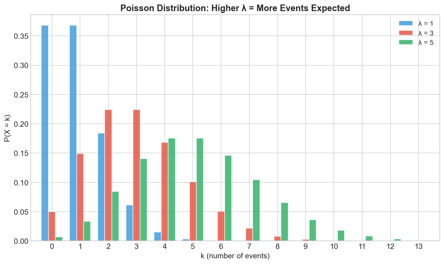 Higher λ shifts probability toward larger counts. With λ = 1, seeing 5 events is rare. With λ = 5, seeing 5 events is common.