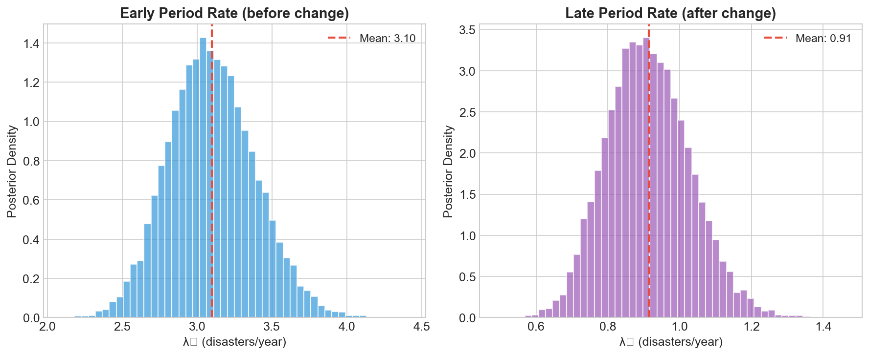 The two rate distributions are well separated. The early period had about 3 disasters per year. The late period had about 1. Strong evidence that a real change occurred.