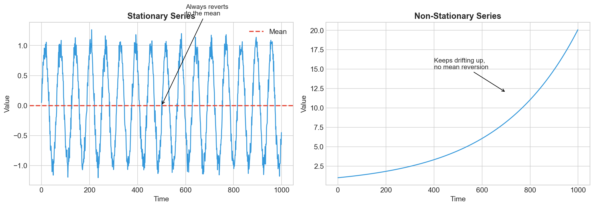 The left chart oscillates around zero. It’s stationary. The right chart trends upward forever. It’s not stationary.