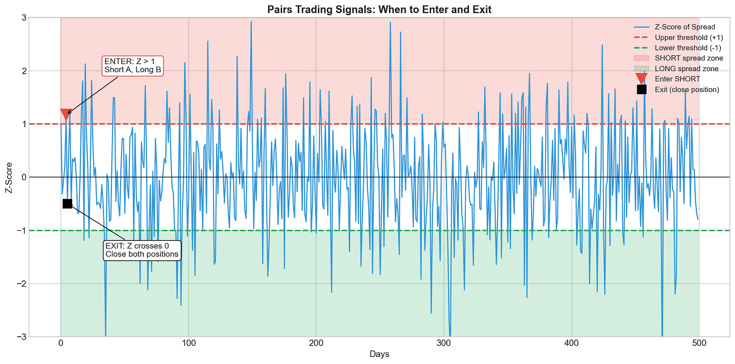The blue line is the z-score of the spread. The red and green zones show when we enter trades. We enter when z crosses the thresholds. We exit when z returns to zero.