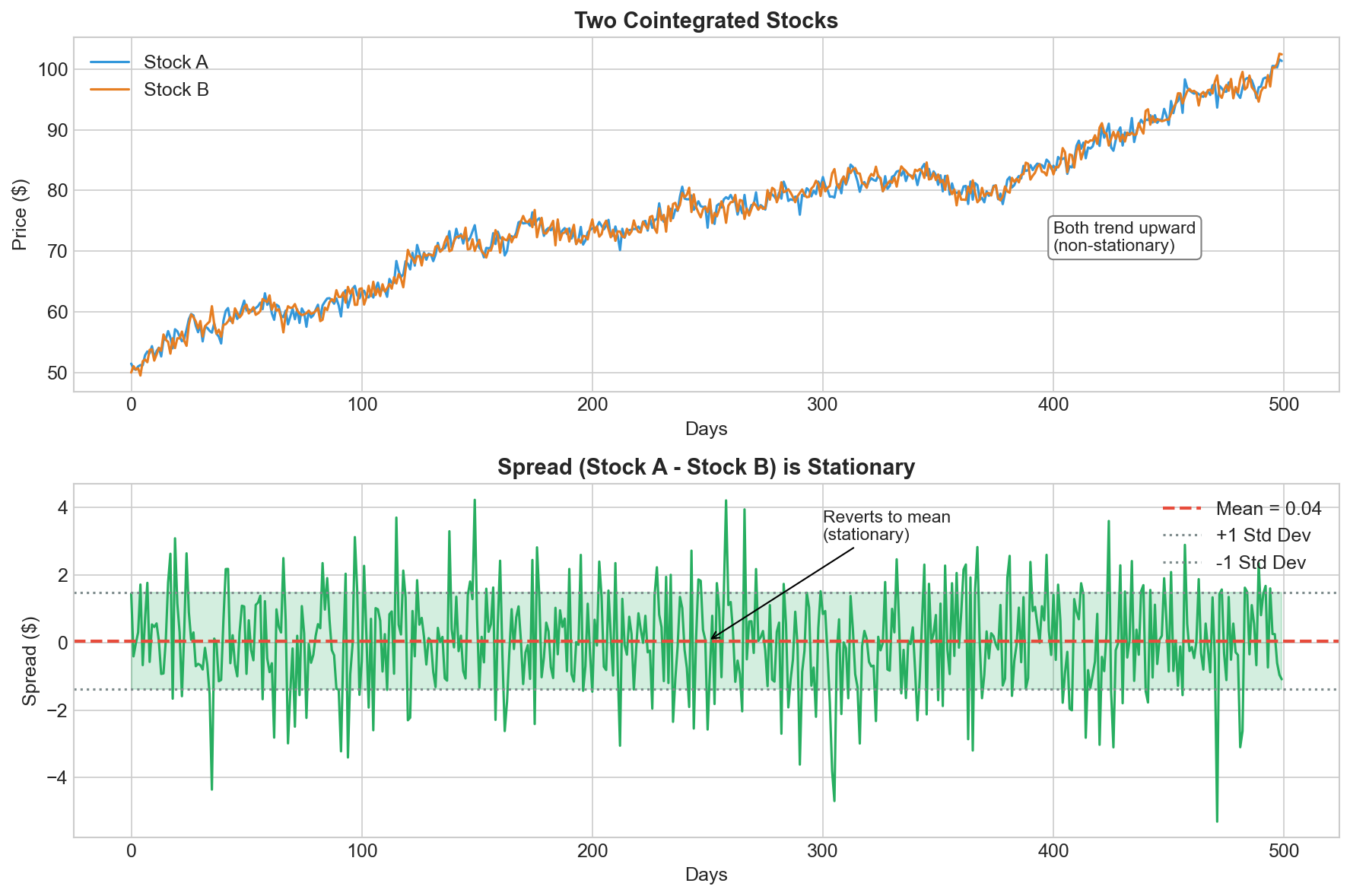 The bottom chart shows their spread. It bounces around a stable mean. The spread IS stationary. This pair is cointegrated.