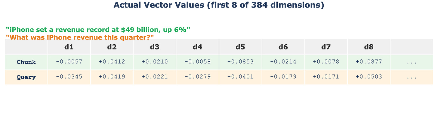 We run every chunk through the same model. Each chunk becomes a list of numbers. Our question, “What was iPhone revenue this quarter?”, also becomes a list of numbers through the same model.