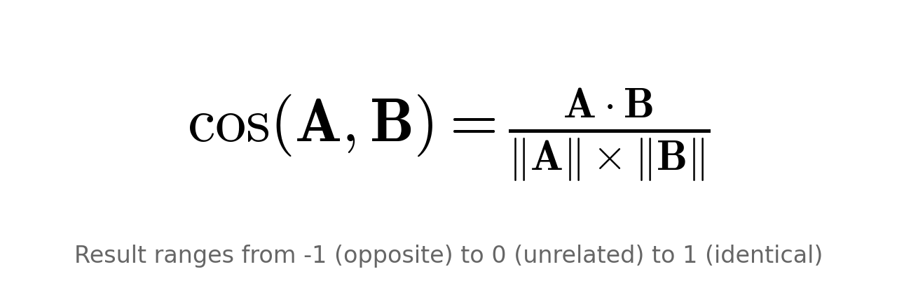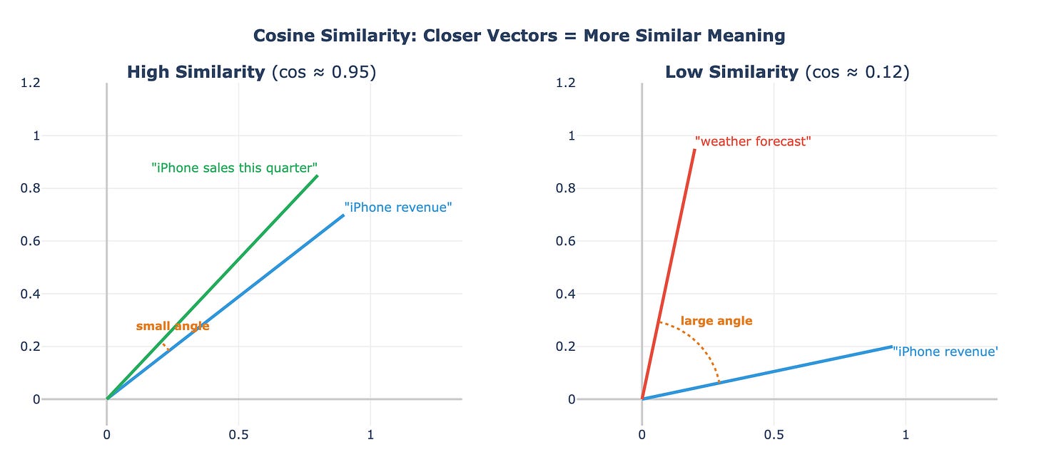 How do we measure “similar”? We use cosine similarity. Think of each list of numbers as an arrow pointing in some direction. Two arrows pointing in nearly the same direction have high cosine similarity (close to 1.0). Two arrows pointing in completely different directions have low cosine similarity (close to 0).