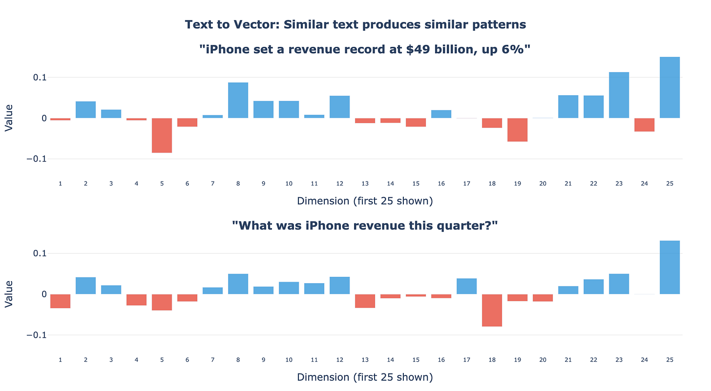 An embedding model takes a piece of text and produces a list of numbers. “iPhone set a revenue record at $49 billion” becomes something like [0.038, -0.021, 0.087, 0.015, -0.044, ...]. The model was trained so that texts about similar topics produce similar lists of numbers.