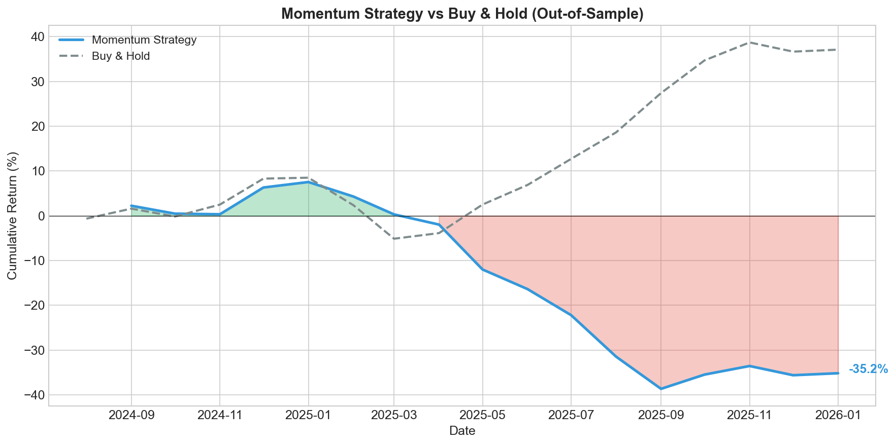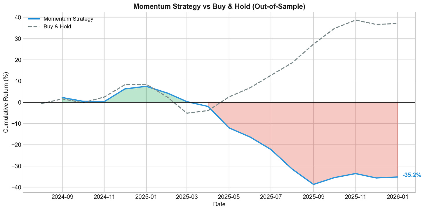 The blue line shows our momentum strategy’s cumulative return on out-of-sample data. The gray dashed line shows a simple buy-and-hold benchmark.