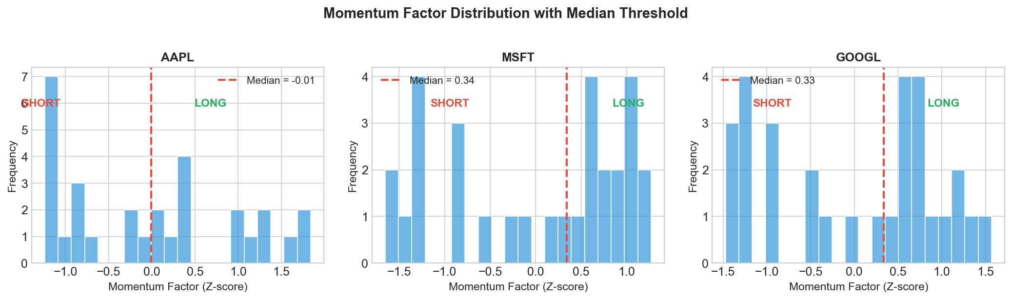 Now we need to convert our momentum factor into a trading signal. We use the median.