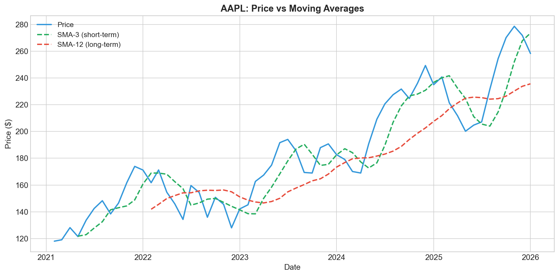 The green line (SMA 3) hugs the price closely and captures recent moves. The red line (SMA 12) is smoother and shows where the stock has been over the past year.